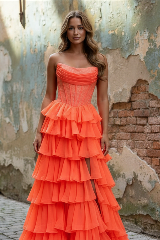 Gorgeous A Line Scoop Neck Orange Chiffon Tiered Prom Dress with Slit