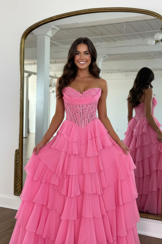 Women's A Line Chiffon Ruffled Long Prom Dresses Sweetheart Corset Party Gowns with Slit