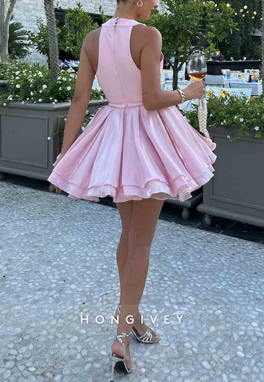 Chic Halter A Line Sweetheart Pink Short Party Dress with Ruffles