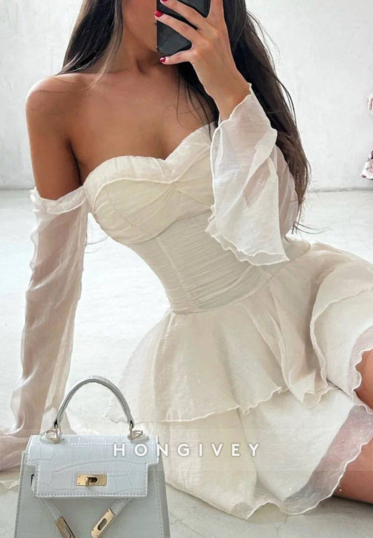 Off the Shoulder Ruched Long Sleeves Asymmetrical A-Line Homecoming Dress