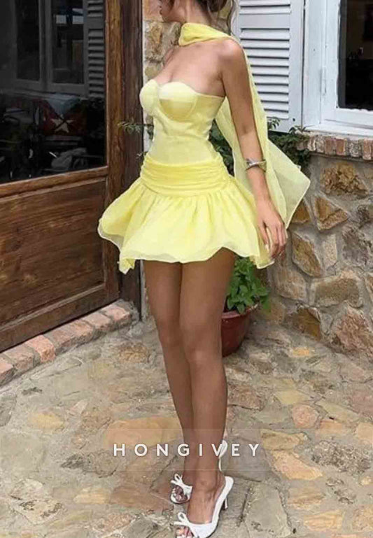 Halter Butter Yellow Strapless Organza Homecoming Dress with Scarf Structured Cups