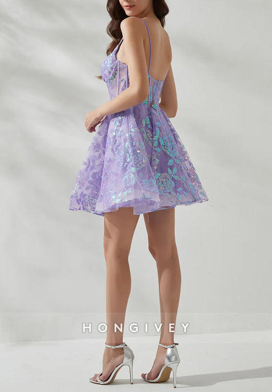 Violet Spaghetti Straps Appliqued A-Line V-Neck Short Homecoming Dress