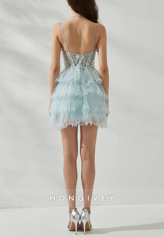 Spaghetti Straps Low Back A-Line Metallic Yarn Short Homecoming Dress with Ruffles