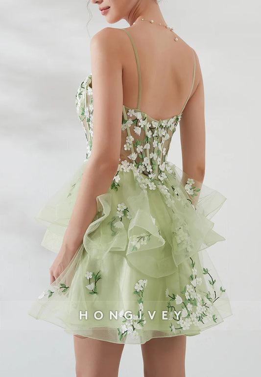 V-Neck Lace Floral Bodice Spaghetti Straps Crisscross Back Mini Homecoming Dresses