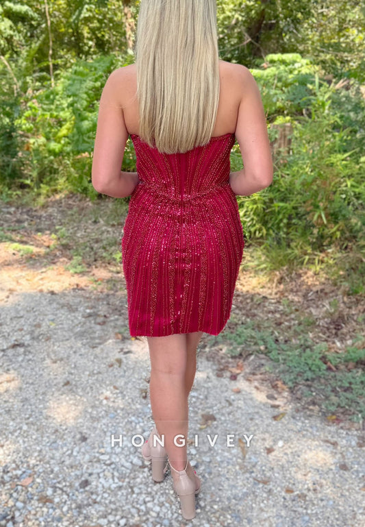 Strapless Burgundy Sheath V-Neck Short Homecoming Dress with Beading