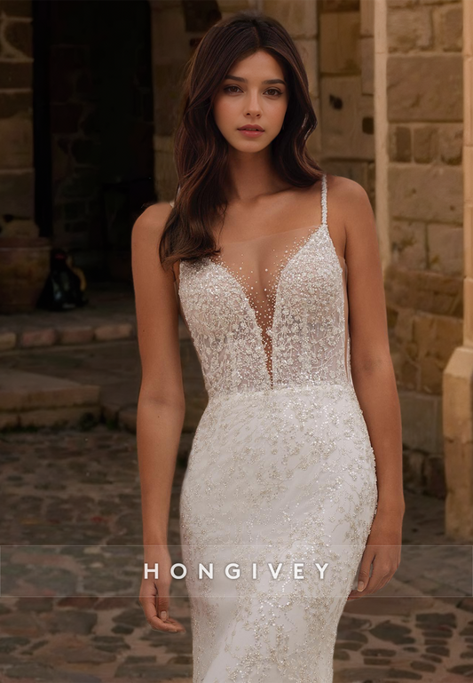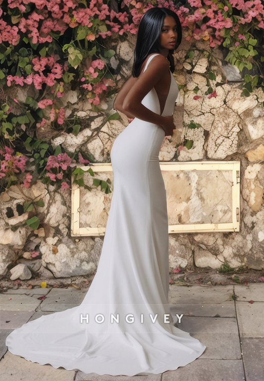 HONGIVEY Sexy V-Neck Backless Straps Mermaid Beach Wedding Dress with Train Bride Gown