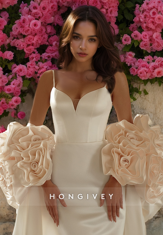 HONGIVEY Chic Floral Mermaid Wedding Dress with Cape Straps Satin Bride Gown with Train