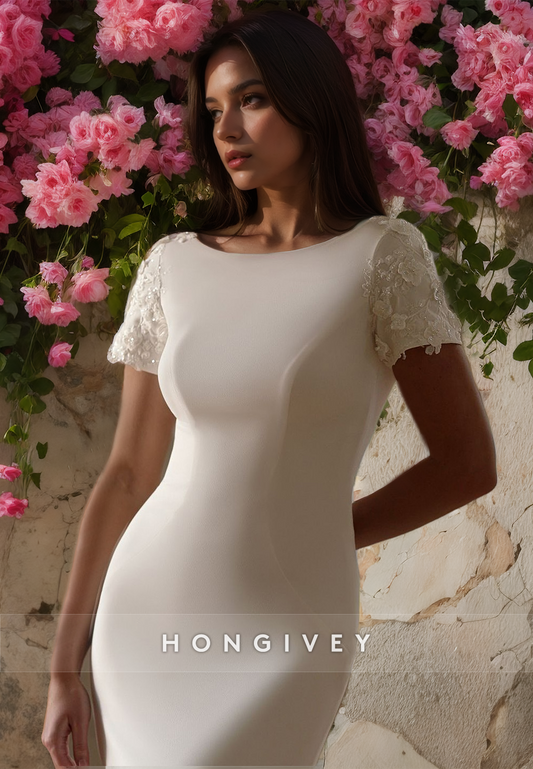 HONGIVEY Short Sleeves Mermaid Wedding Dress Empire Waist Bateau Fitted Satin Bride Gown