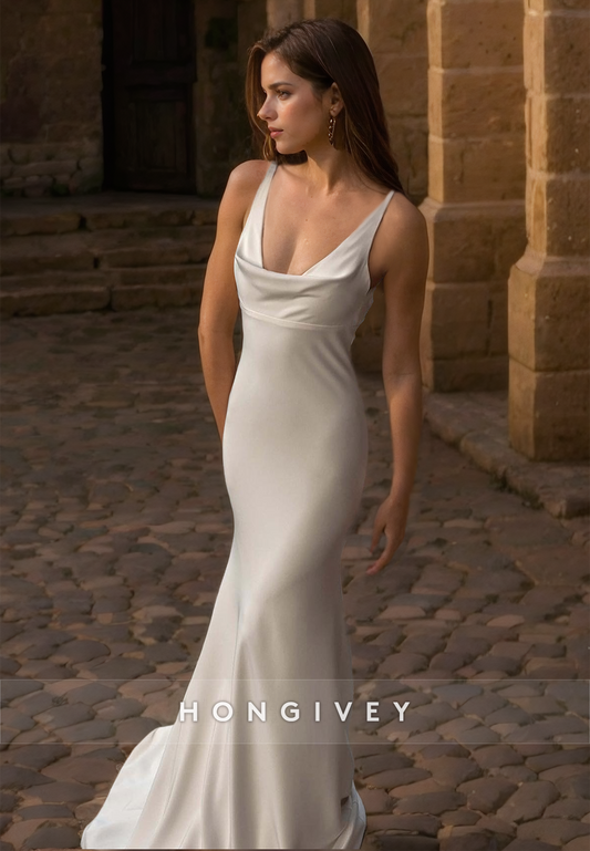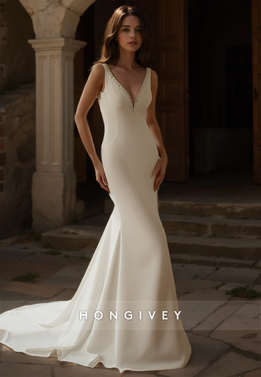 HONGIVEY Chic Sexy V-Neck Sleeveless Mermaid Satin Beach Wedding Dress 2024