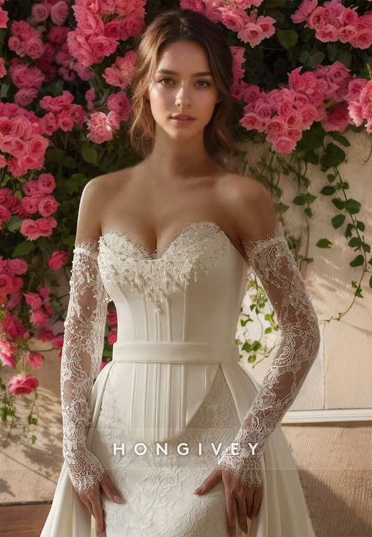 HONGIVEY Strapless Mermaid Wedding Dress Long Sleeves Sweetheart Lace Applique Bridal Dresses