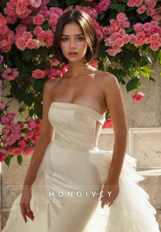 HONGIVEY Satin Mermaid Wedding Dress with Detachable Train Strapless Tulle Bride Gown