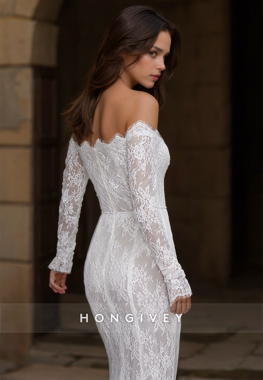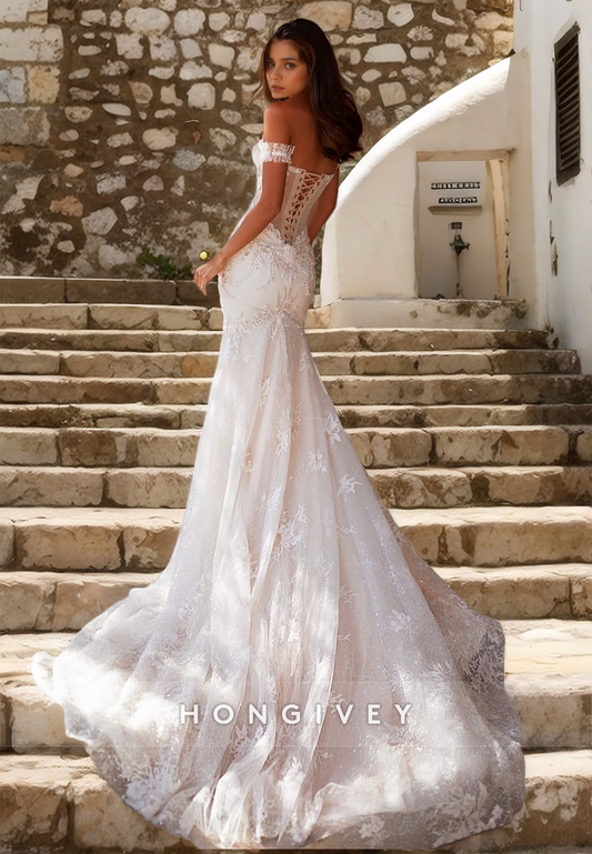 HONGIVEY New Mermaid Wedding Dresses with Train Off-Shoulder Lace Beads Bride Gown