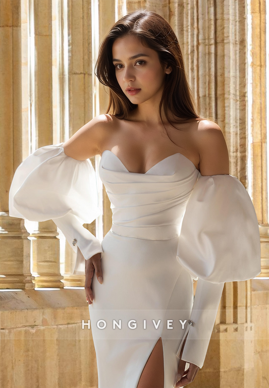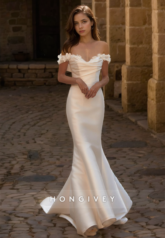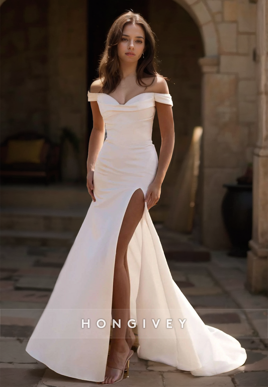 HONGIVEY Simple Sweetheart Off-Shoulder Mermaid Wedding Satin Dress with Side Slit