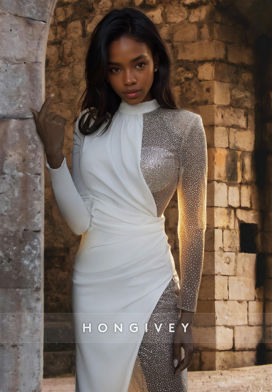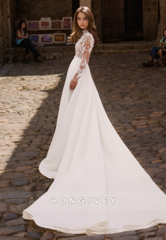 HONGIVEY High Neck Mermaid Wedding Dress Long Sleeves Side Slit Applique Bride Gown with Train