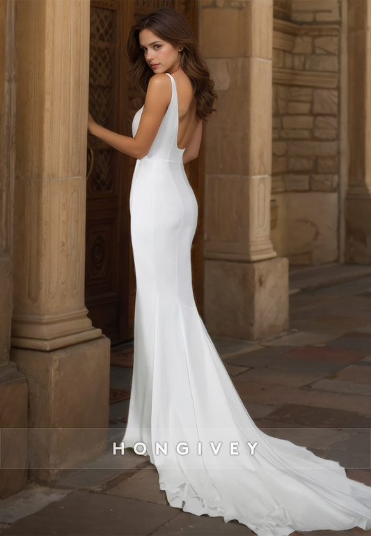 HONGIVEY Straps Backless Satin Mermaid Wedding Dress with Side Slit Simple Bride Gown