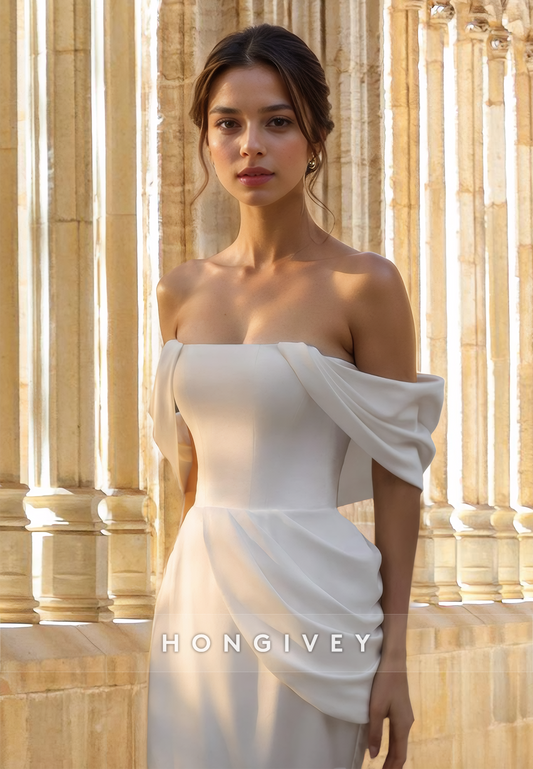 Chic Off-Shoulder Ruched Trumpet Satin with Side Slit Wedding Dress Bride Gown