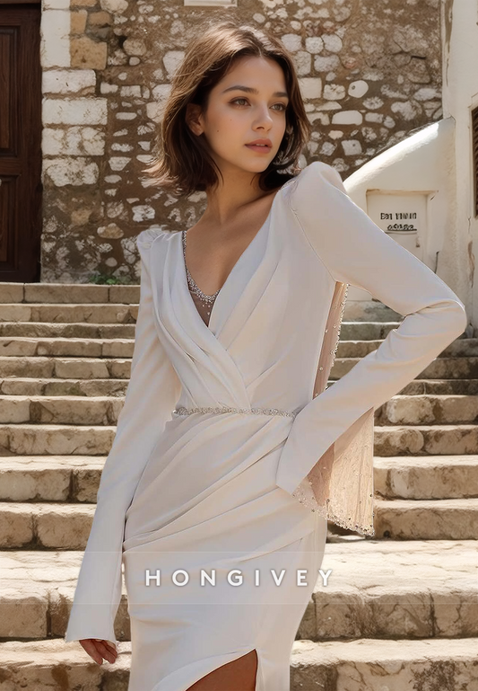 HONGIVEY Asymmetrical Long Sleeves Wedding Dress with Train Elegant Mermaid Bride Gown