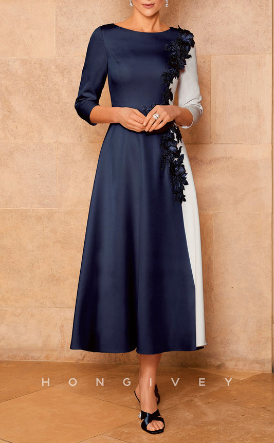 HM214 - A-Line Scoop Lace Applique 3/4 Sleeves Tea-Length Mother of the Bride Dress