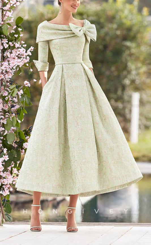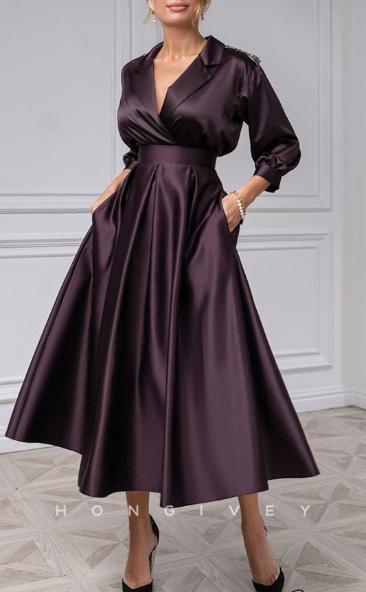 3/4 Sleeve A-Line Cocktail Dresses Formal Wedding Tea Length V Neck Satin with Pocket and Bow
