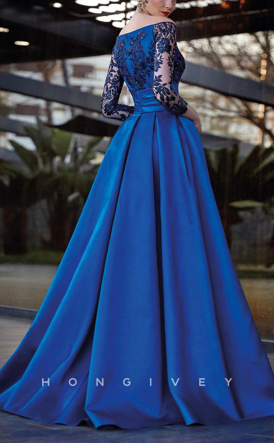 HM171 - Sexy Satin A-Line Off-Shoulder Empire Lace Sleeves Pockets With Side Slit Mother of the Bride Dress
