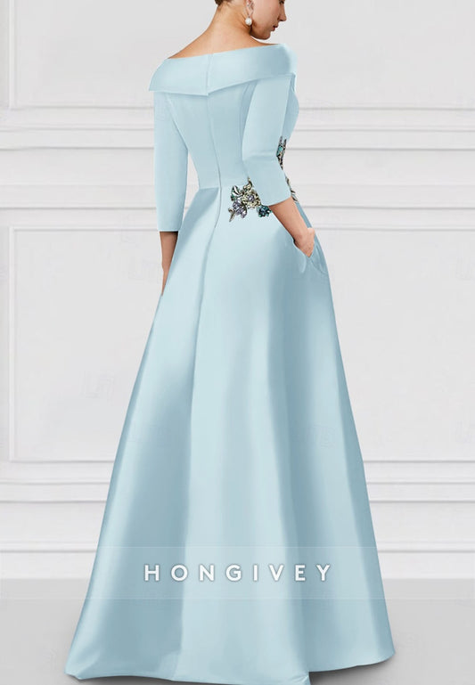 HM145 - Sexy Satin A-Line Empire Scoop 3/4 Sleeves Floral Appliques Mother of the Bride Dress