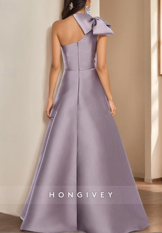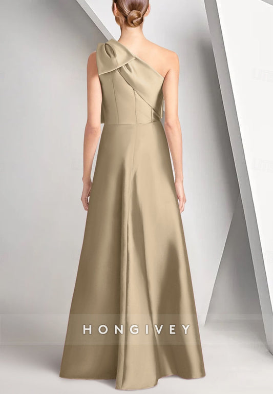 A-line Floor-Length Formal Dresses Mother of Bride One Shoulder Satin Pleated Bowknot Evening Gown