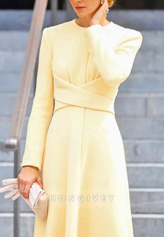 Long Sleeve Scoop A-line Tea-Length Pleated Mother of the Bride
