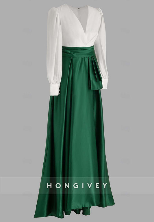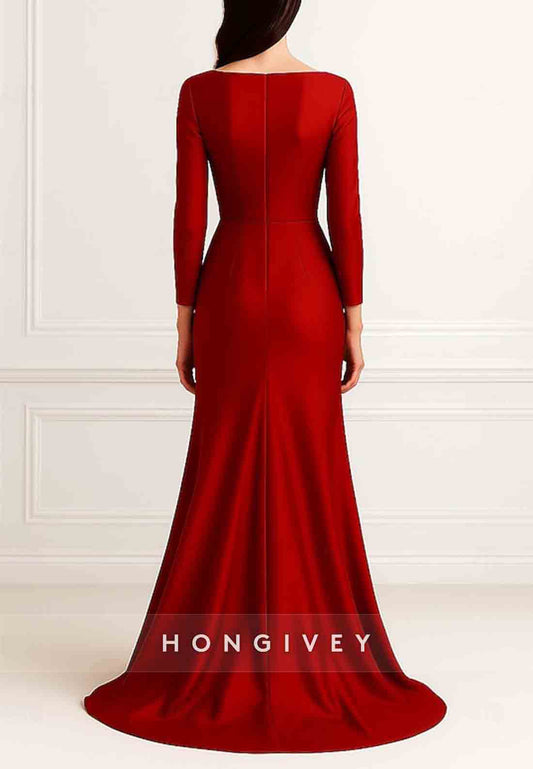 A-line High Slit Evening Gown Floor-Length V Neck Long Sleeve Pleated Mother of the Bride