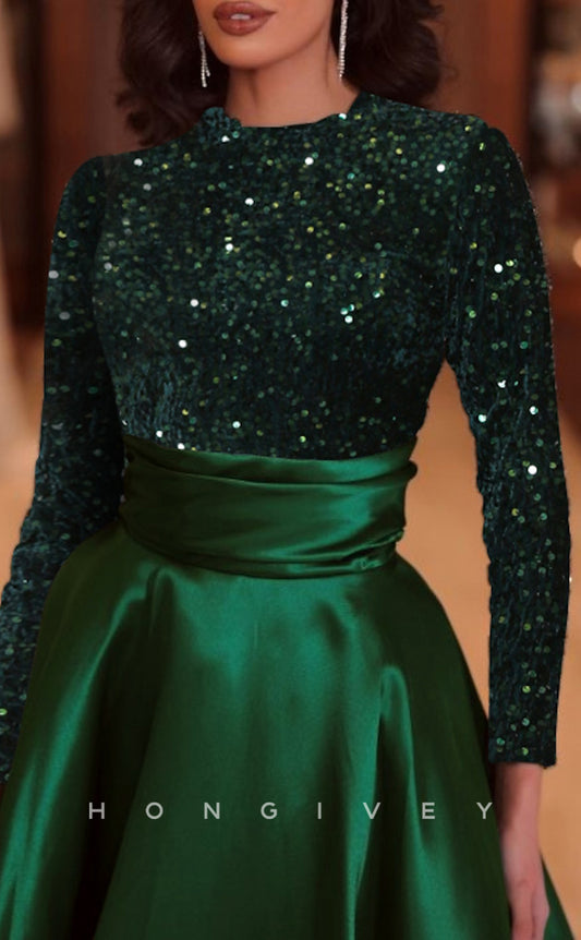 Sequined Foraml Wedding Sheath Bateau Neck Long Sleeves Evening Gowns with Ruffles
