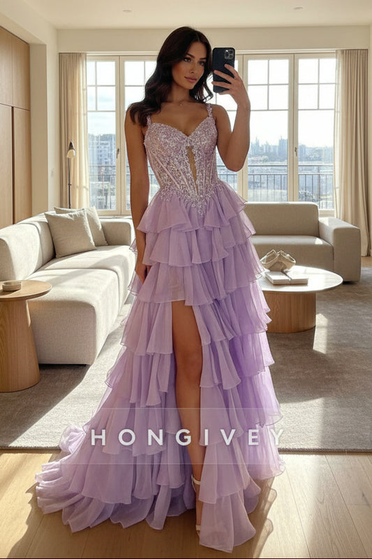 Lilac Spaghetti Straps Side Slit Appliqued Corset Prom Dress with Ruffles