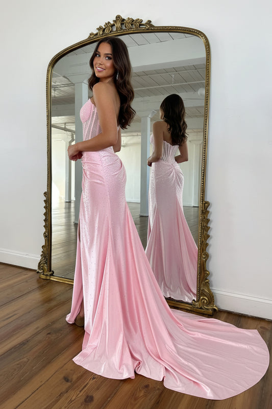 Sparkly Mermaid Strapless Pink Corset Prom Dress with Beading Split Front