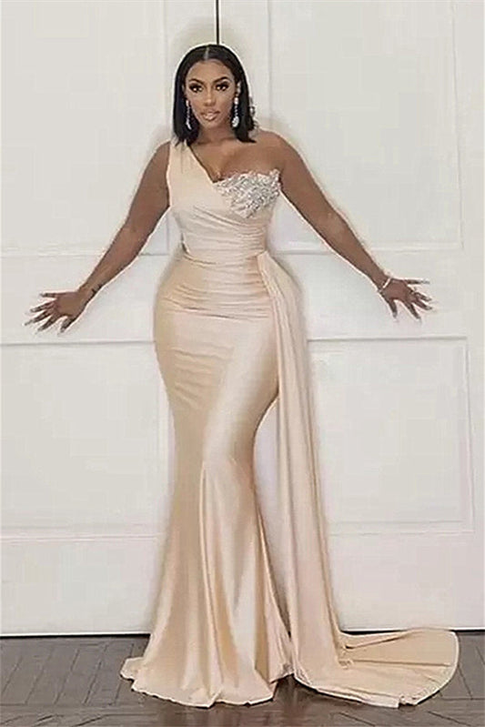 Strapless One Shoulder Sequins Chapel Train Front Side Prom Dress