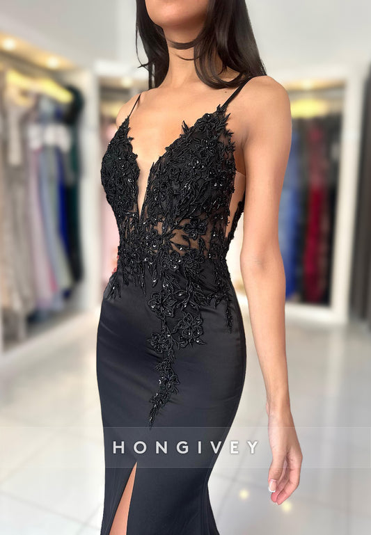 Chic Black Spaghetti Straps Applique Slit Formal Evening Dress Party Gown