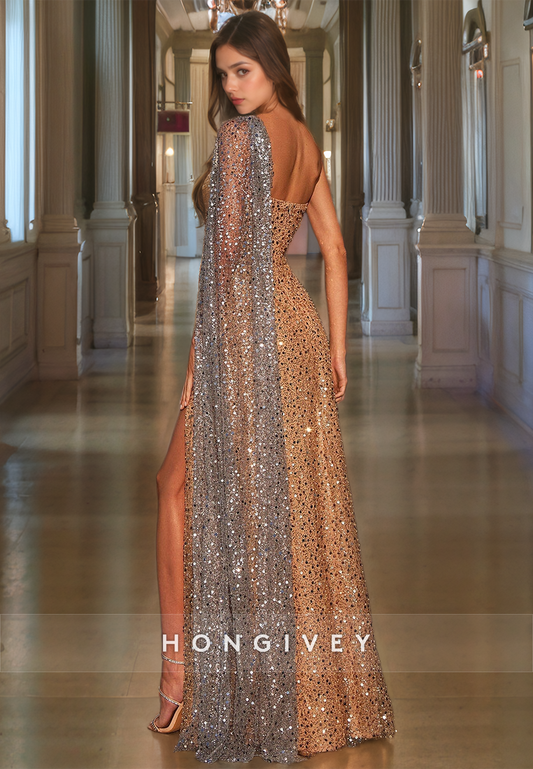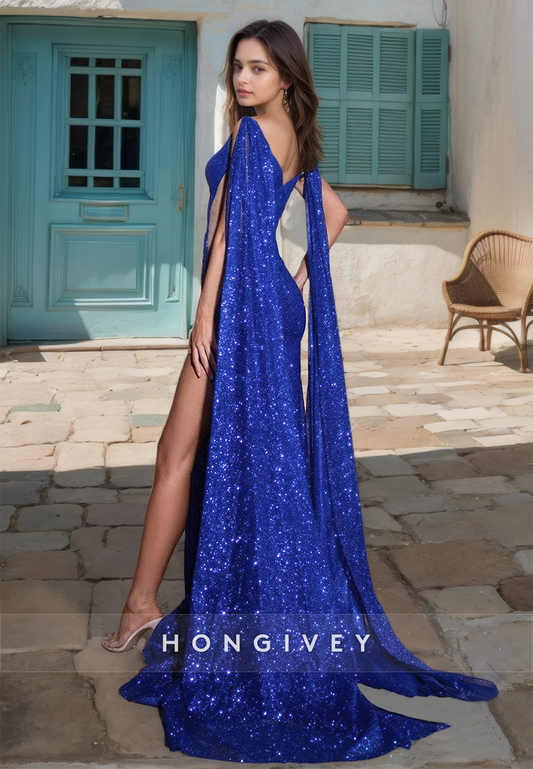 Sexy Sequined Mermaid with cape V-Neck Side Slit Glitter Blue Formal Evening Dress