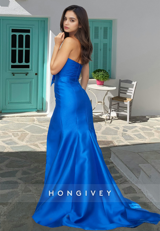 Strapless with Bow Royal Blue Satin Trumpet Formal Evening Dress Gown HONGIVEY