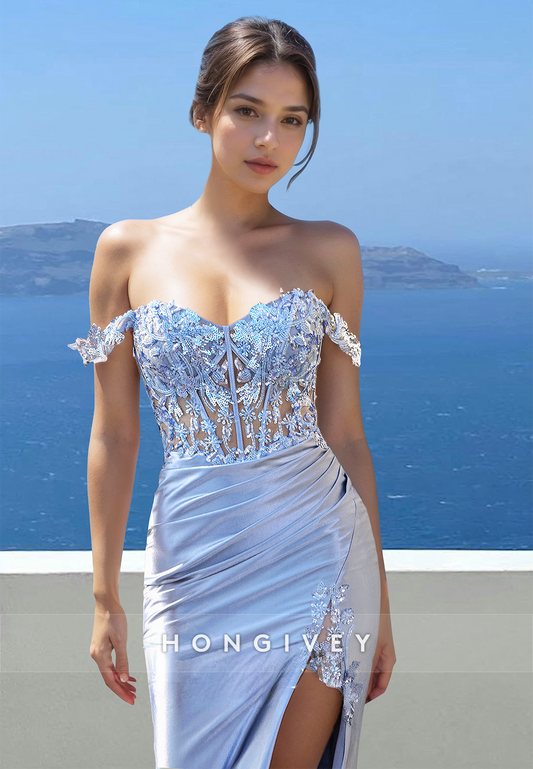 Sexy Off-Shoulder with Slit Applique Beaded Satin Sheath Evening Dress HONGIVEY