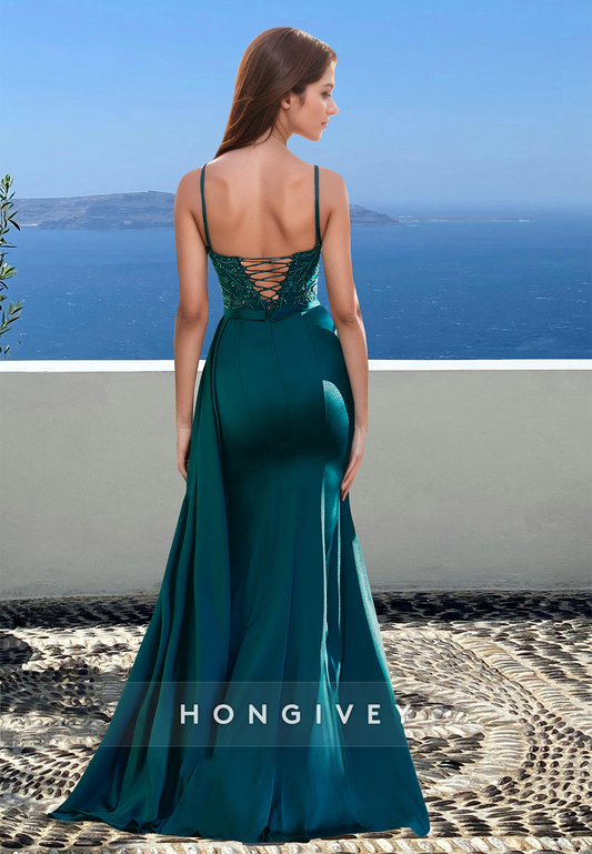 Sexy Green V-Neck Straps Mermaid Applique with Train Evening Dress