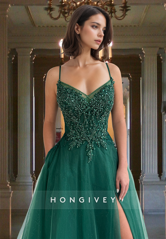 2025 Straps Applique Beaded Dark Green Tulle Prom Dress Ball Gown HONGIVEY