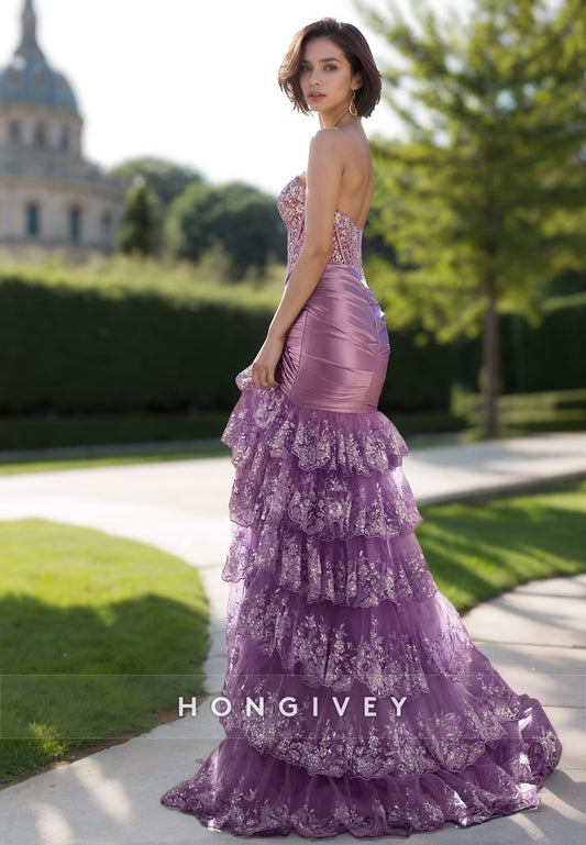 Sparkle Sequined Tiered Evening Dress Purple Strapless Tulle Party Prom Gown
