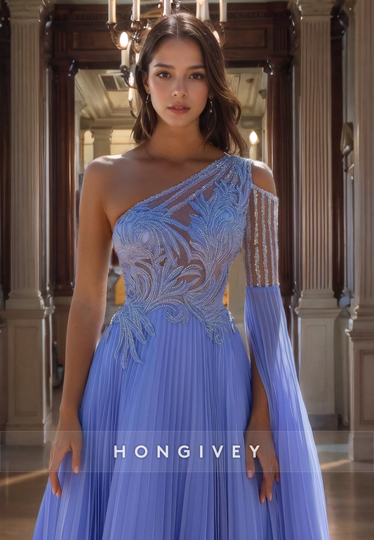 2025 Purple Tulle Prom Dress Beaded One Shoulder Pleated Evening Dress