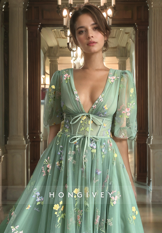 Spring Floral V-Neck Sleeves Tulle Quinceanera Homecoming Prom Dress Ball Gown