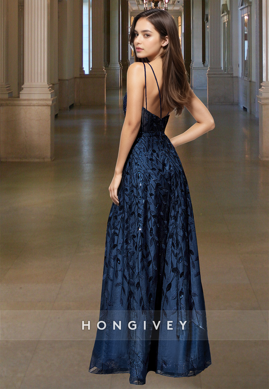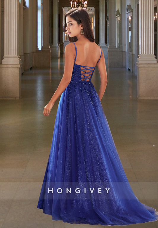 Blue Spaghetti Straps Sheer Applique with Slit Formal Evening Dress Party Gown