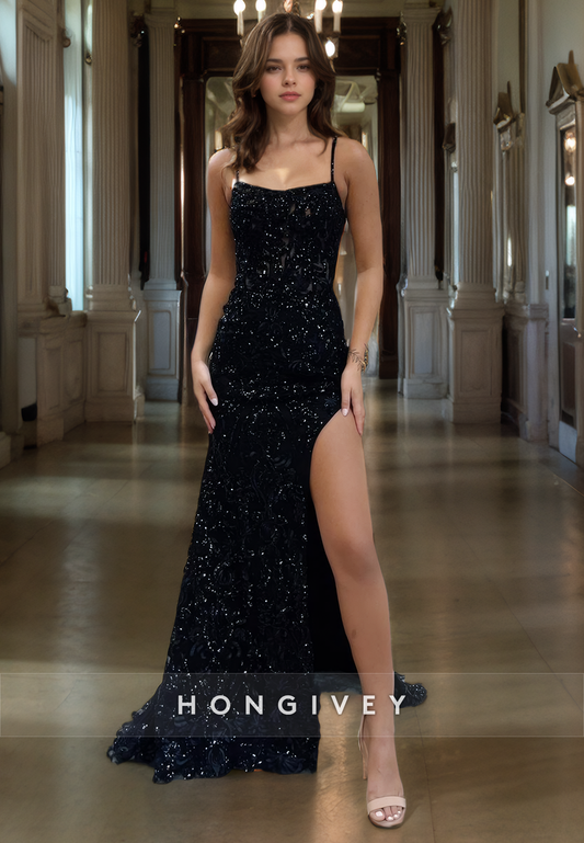 Chic Sequined Applique Square Spaghetti Straps with Slit Evening Dress