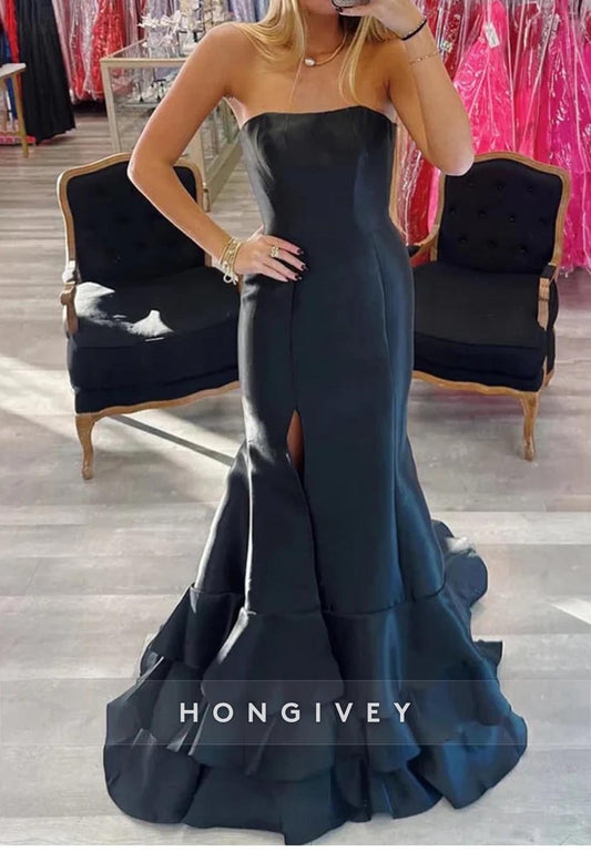 Tube Top Slit Tiered Mermaid Long Prom Dresses with Brush Train