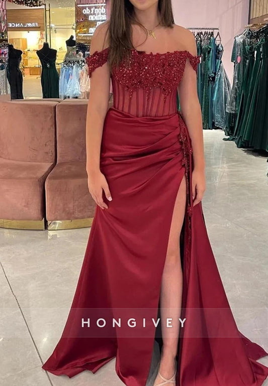 Off-Shoulder Floral Lace Guest of Wedding Maxi Split Prom Dresses with Court Train