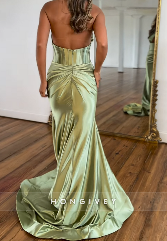 Ruched High Slit Strapless Mermaid Evening Prom Dresses with Train