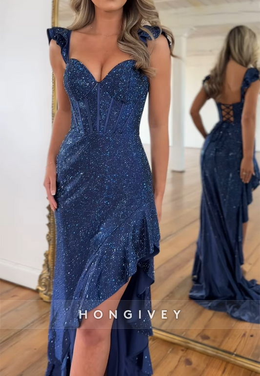Fully Sequined Strap Side Slit Guest Prom Dresses with Sweep Train