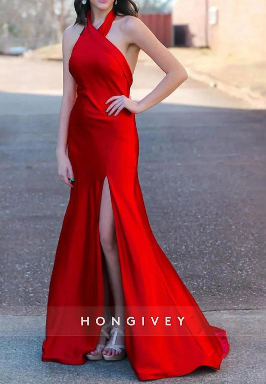 Halter Mermaid Split Guest of Wedding Prom Dresses with Sweep Train