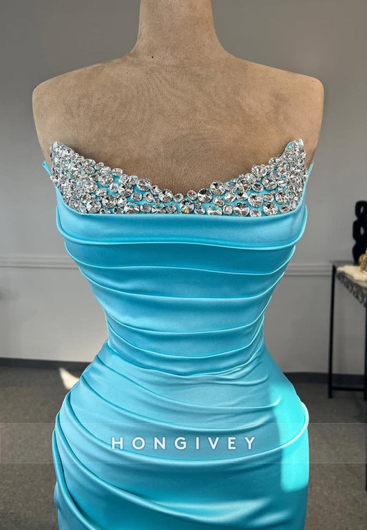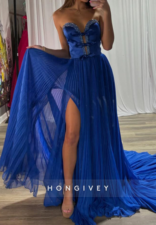 Strapless Pleated Sleeveless Floor-Length Prom Dresses with High Slit
