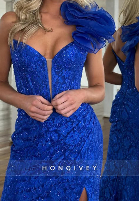 Royal Blue Floral Embossed Crystal Beaded Mermaid Holiday Dresses with High Slit